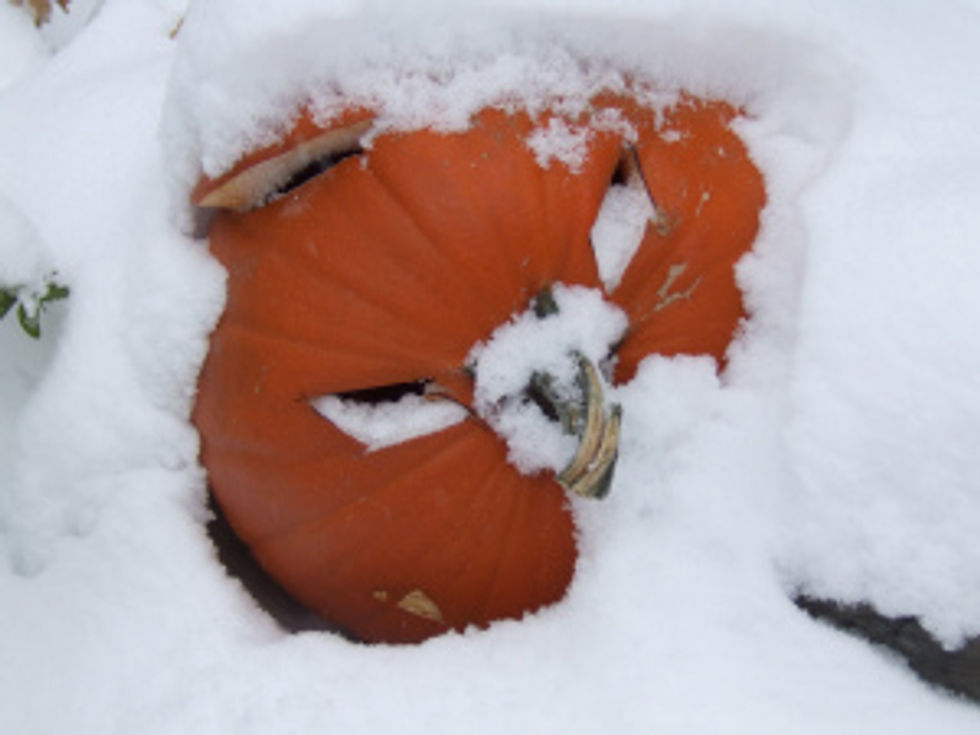 There are still leaves on the trees, pumpkins on the steps, and green grass buried under the piles of white, but it’s definitely winter now.